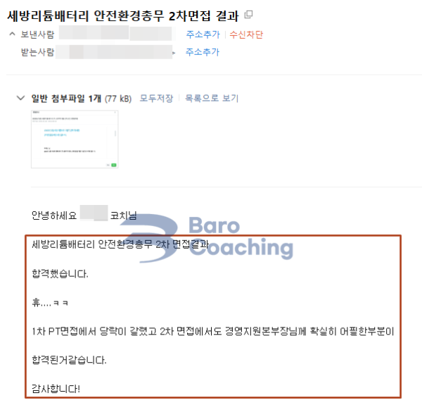 바로코칭에서 컨설팅 받은 학생의 세방리튬배터리 면접 합격 후기입니다.