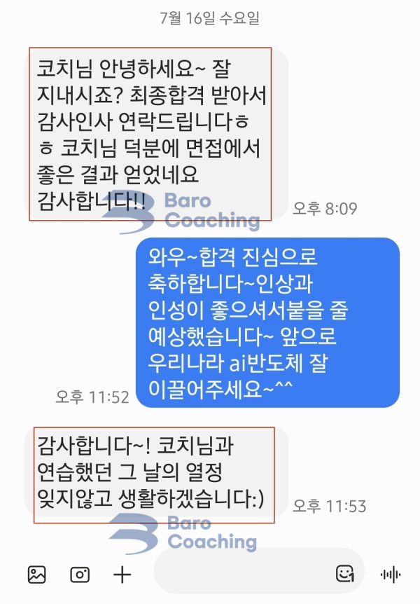 바로코칭을 통해 합격한 수강생들의 실제 문자/카톡 후기를 모았습니다.