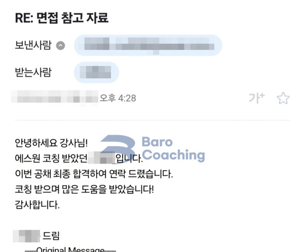 바로코칭을 통해 합격한 수강생들의 실제 문자/카톡 후기를 모았습니다.
