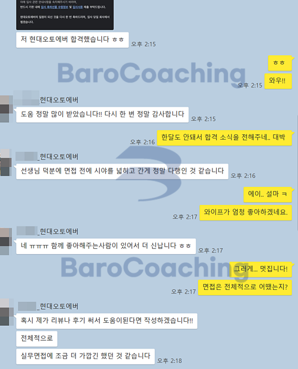 바로코칭을 통해 합격한 수강생들의 실제 문자/카톡 후기를 모았습니다.
