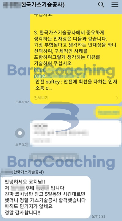 바로코칭에서 컨설팅 받은 학생의 한국가스기술공사 면접 합격 후기입니다.