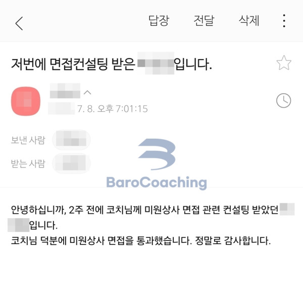 바로코칭을 통해 합격한 수강생들의 실제 문자/카톡 후기를 모았습니다.