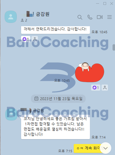 바로코칭을 통해 합격한 수강생들의 실제 문자/카톡 후기를 모았습니다.