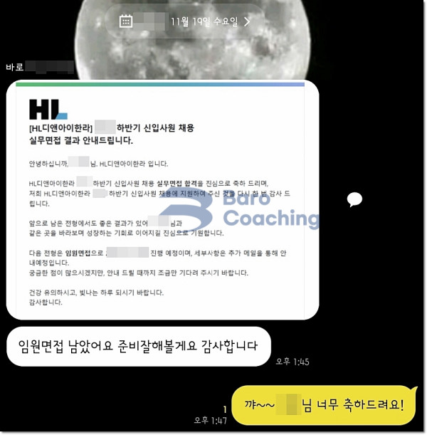 바로코칭을 통해 합격한 수강생들의 실제 문자/카톡 후기를 모았습니다.