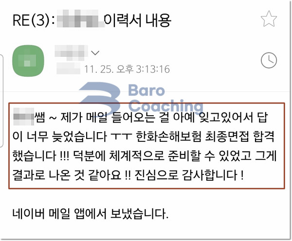 바로코칭에서 컨설팅 받은 학생의 한화손해보험 면접 합격 후기입니다.